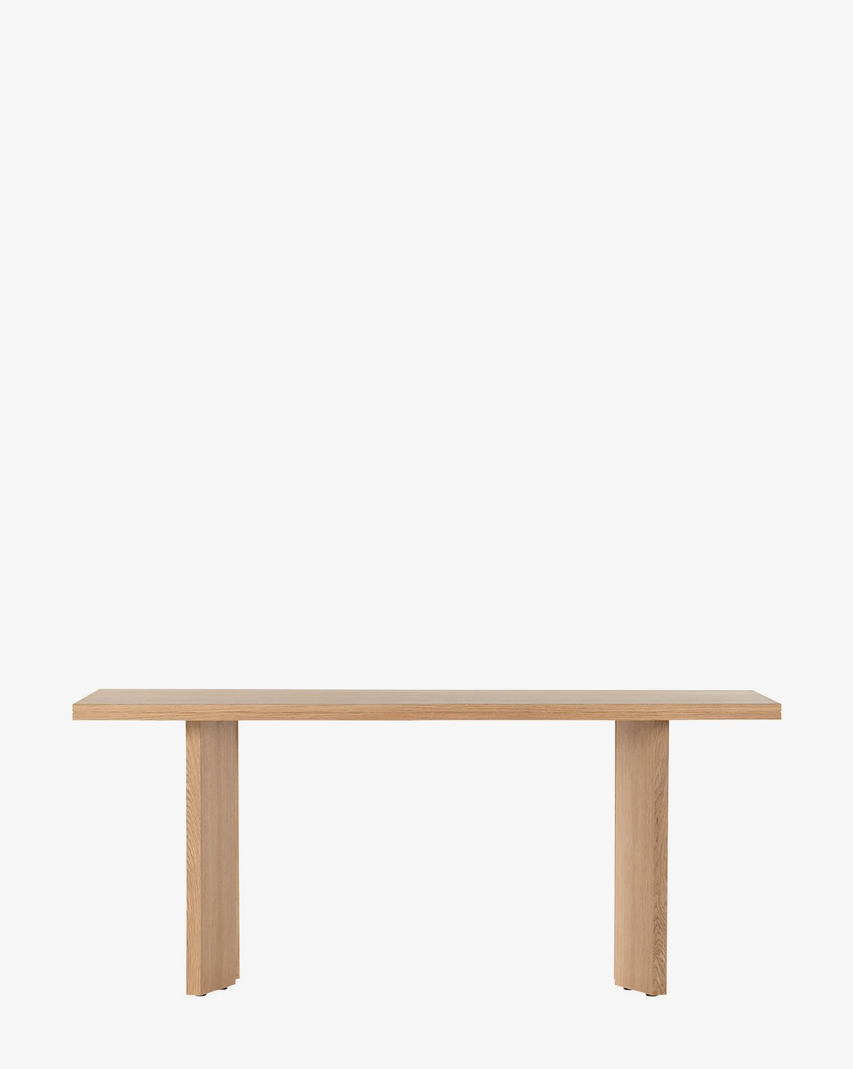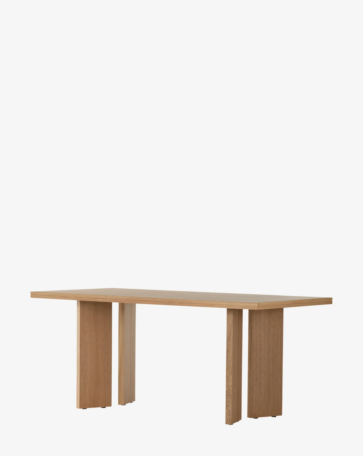 With a modernized traditional tabletop design, the Althea Dining Table is crafted from a mix of solid oak and oak veneer. The split and angled legs add intrigue and dimension to the table which maintains its organic details with a natural finish.