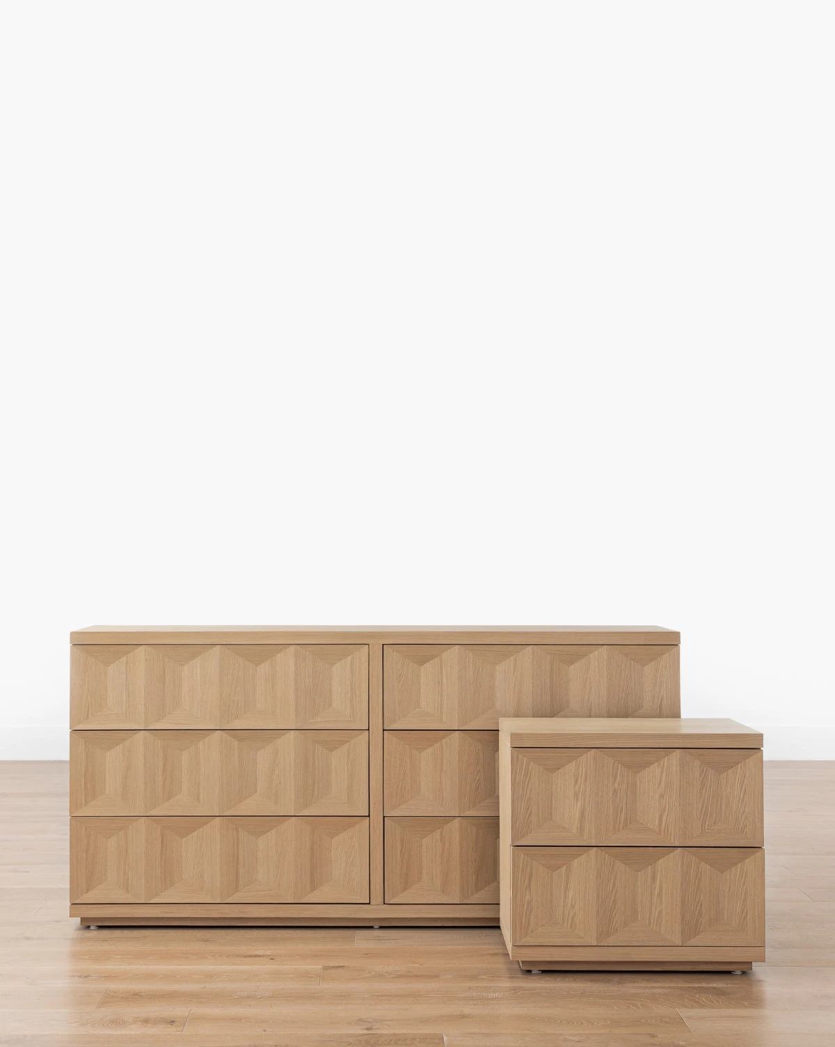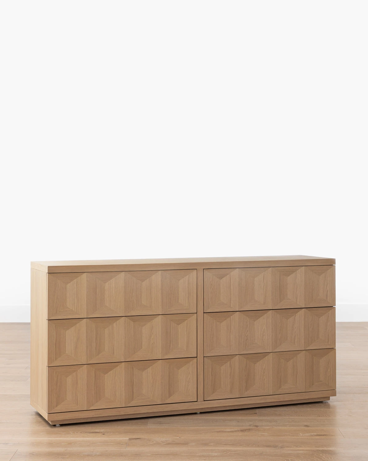 With a blend of geometric and organic motifs, our Beacon 6-Drawer Dresser takes a streamlined approach to visual intricacy. The white oak dresser includes spacious storage that makes it as functional as it is beautiful. In a neutral tone, the dresser is a versatile modern piece for your bedroom styling.