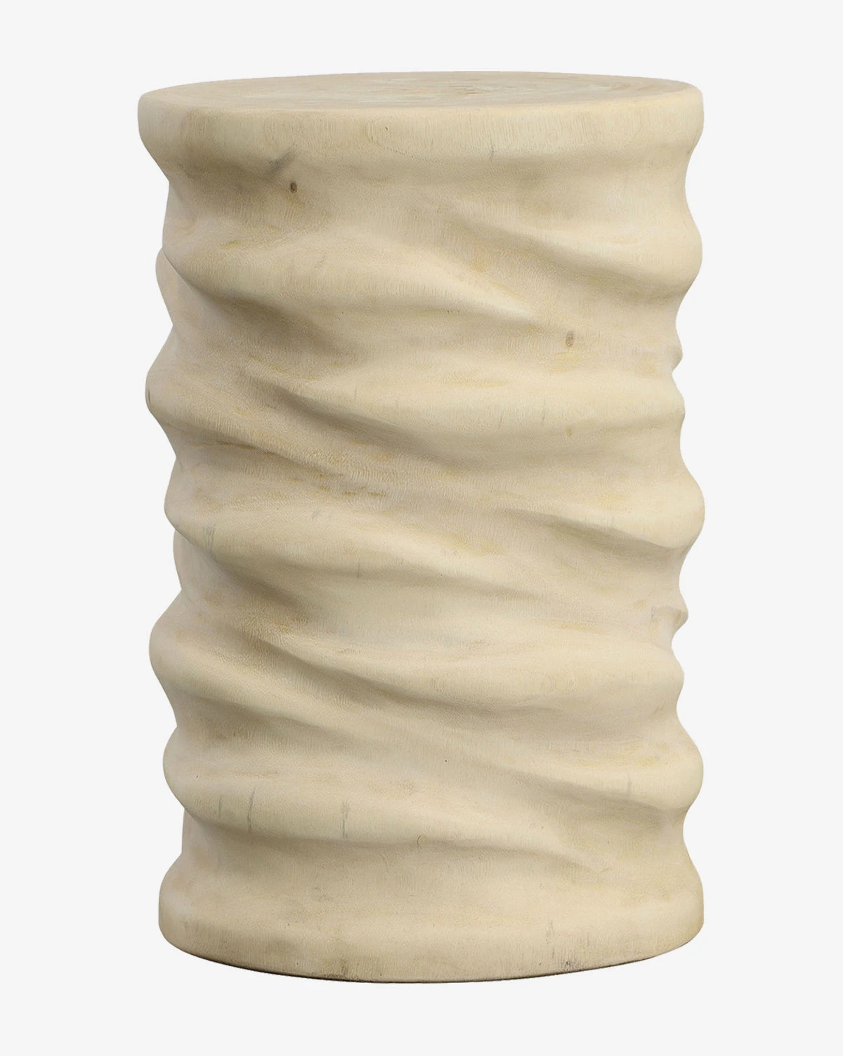 An exceptional blend of organic and modern, the Cavan Stool showcases carved details of the suar wood in a light natural finish. Its sculptural design gives it a contemporary feel, ideal for use as a pedestal or end table.