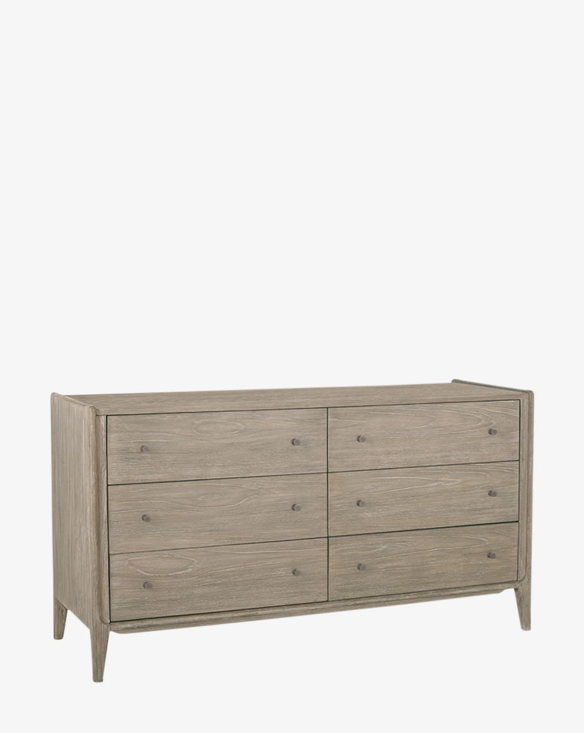 With a frame inspired by mid-century design, the Chandler Dresser draws the eye with its clean silhouette and fawn finish. Crafted from teak, this casually approachable design features simple bronze pulls, lending a unique moment of visual contrast.