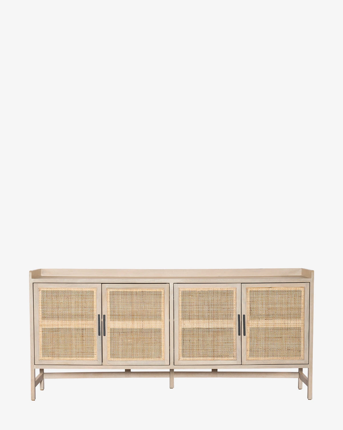 Set the mood with the high-contrast design of the Dahlia Sideboard. With textural woven cane fronts, and black-washed mango framing, this sideboard features spacious shelving for dinnerware and more, all finished with sleek black iron hardware.