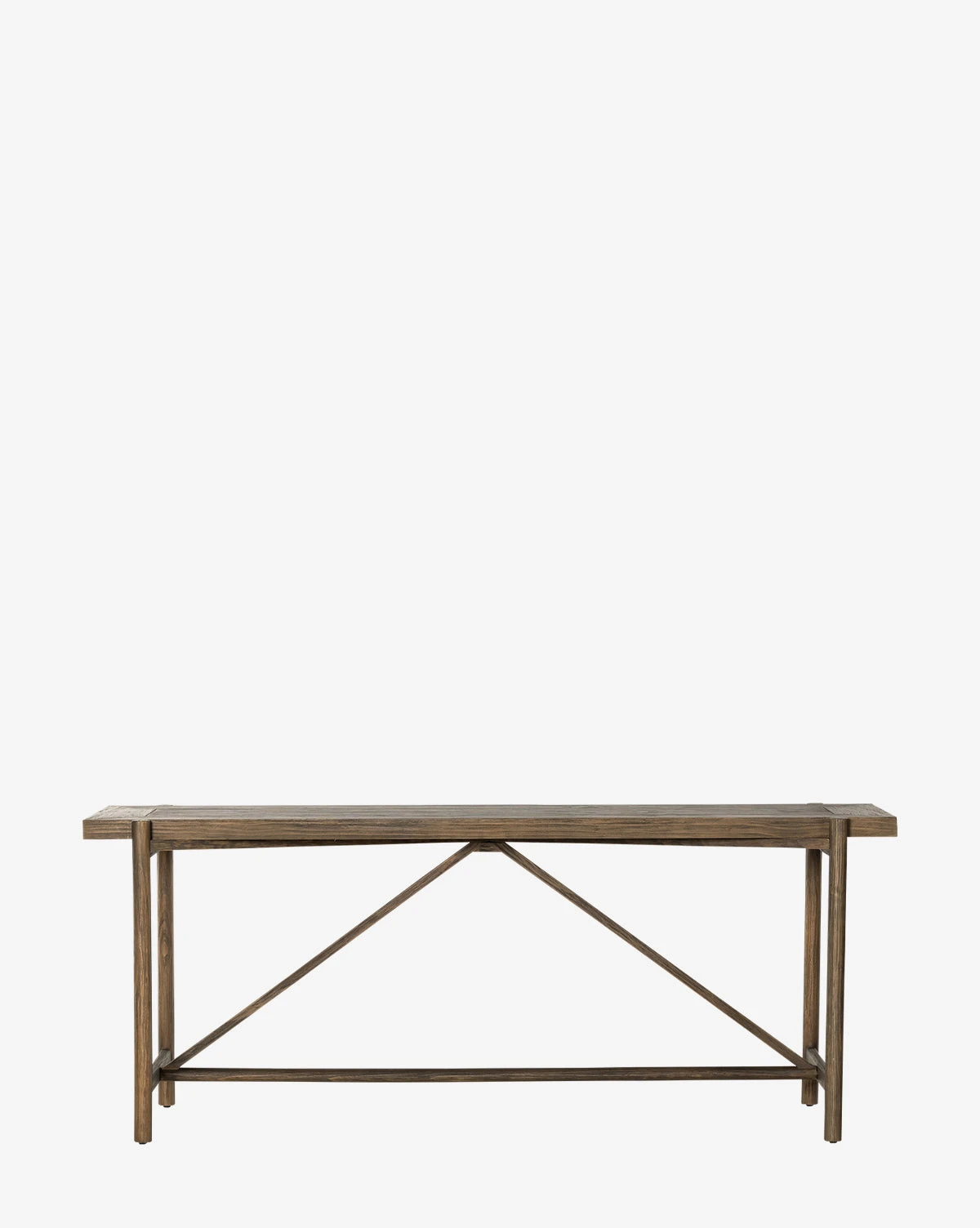 An elegant, farmhouse-style console, the Dane Console features clean lines and exposed metal hardware. Crafted from solid pine, the table has a sienna brown finish, bringing a warm and organic feel to your living room or entryway styling.