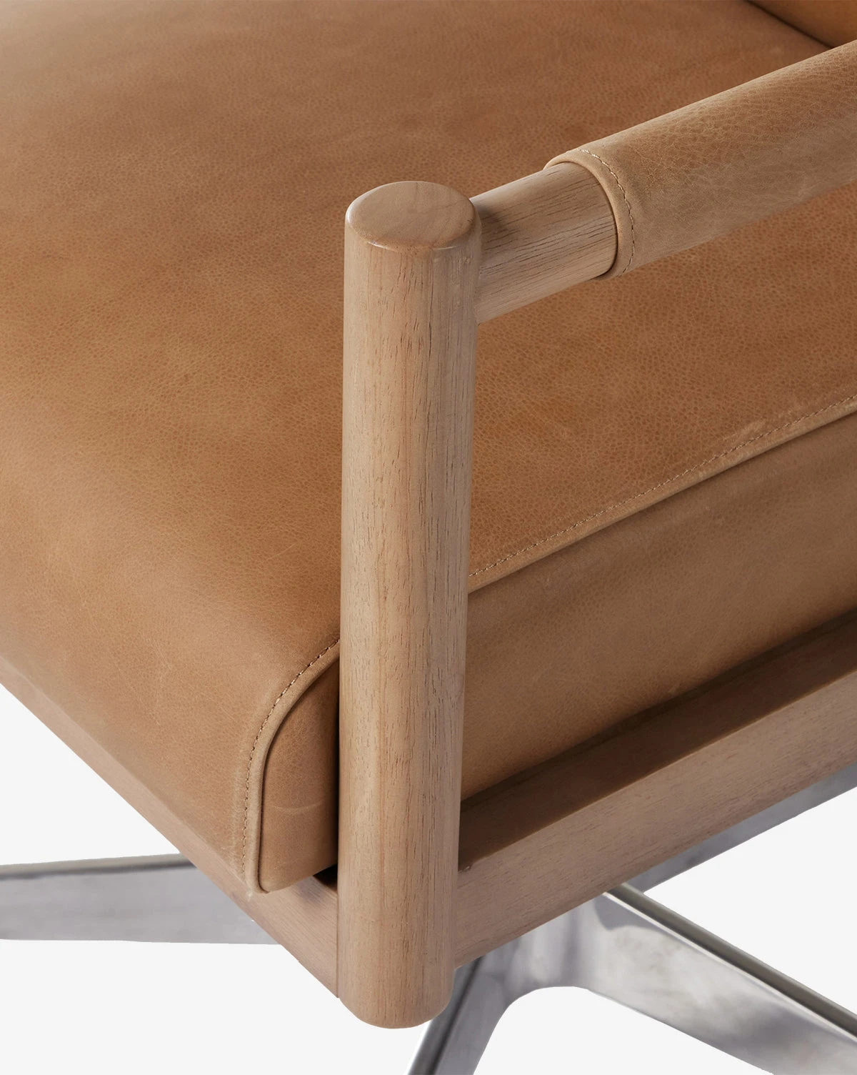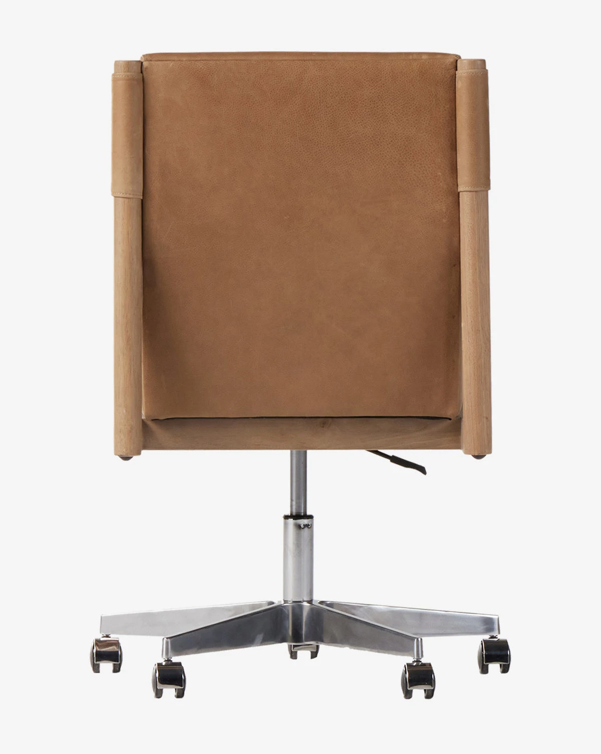 With cushions upholstered in either top grain leather or oatmeal performance fabric, the Darby Desk Chair is elevated and inviting. Its sophisticated mix of materials makes it a unique presence in your space, while wheels and adjustability add functionality to its modern design.
