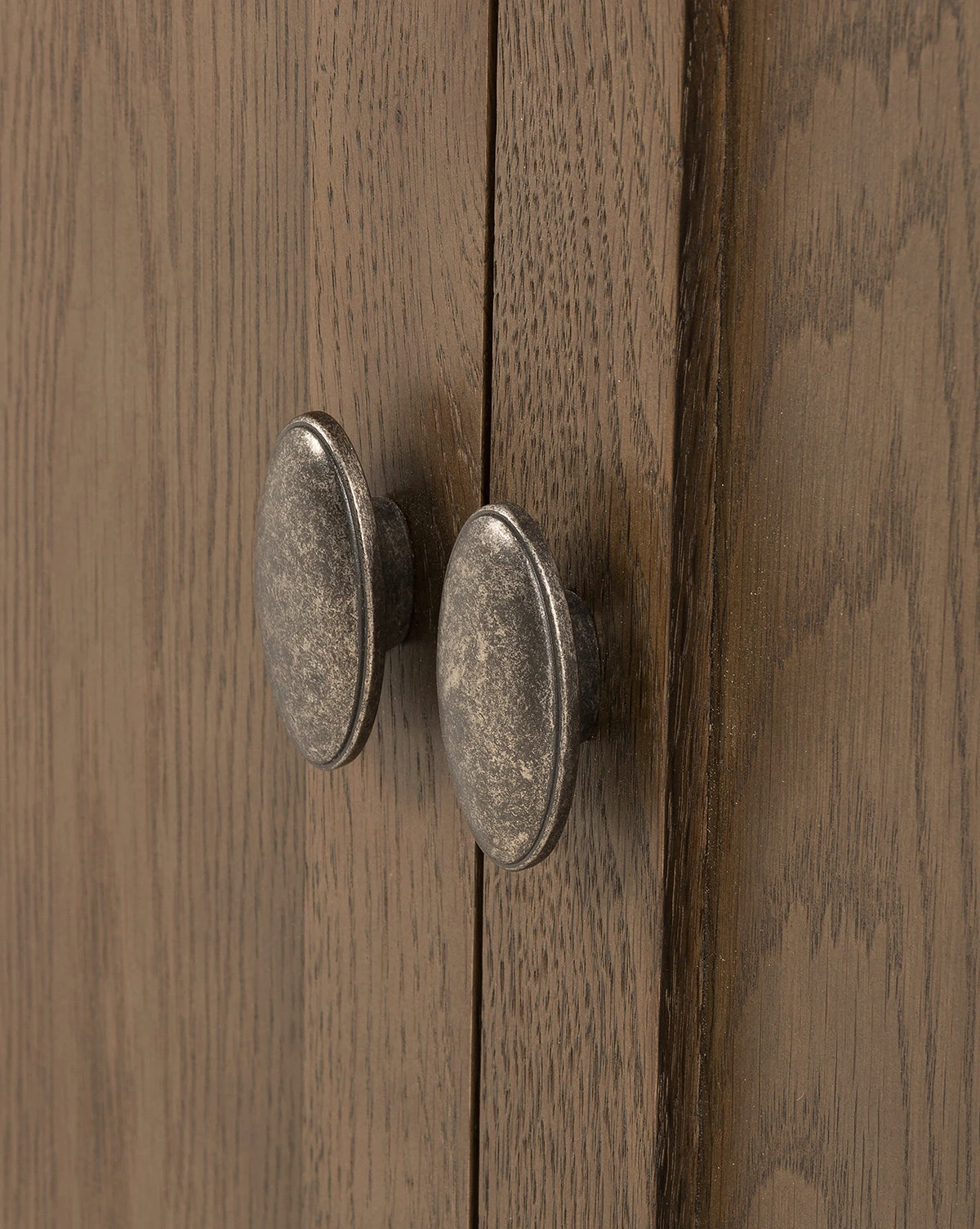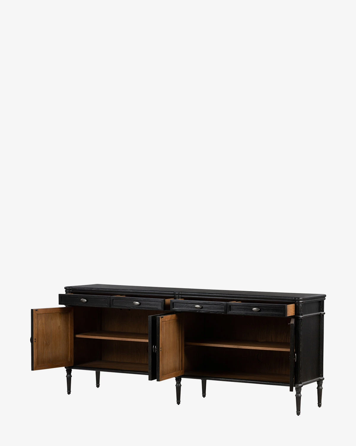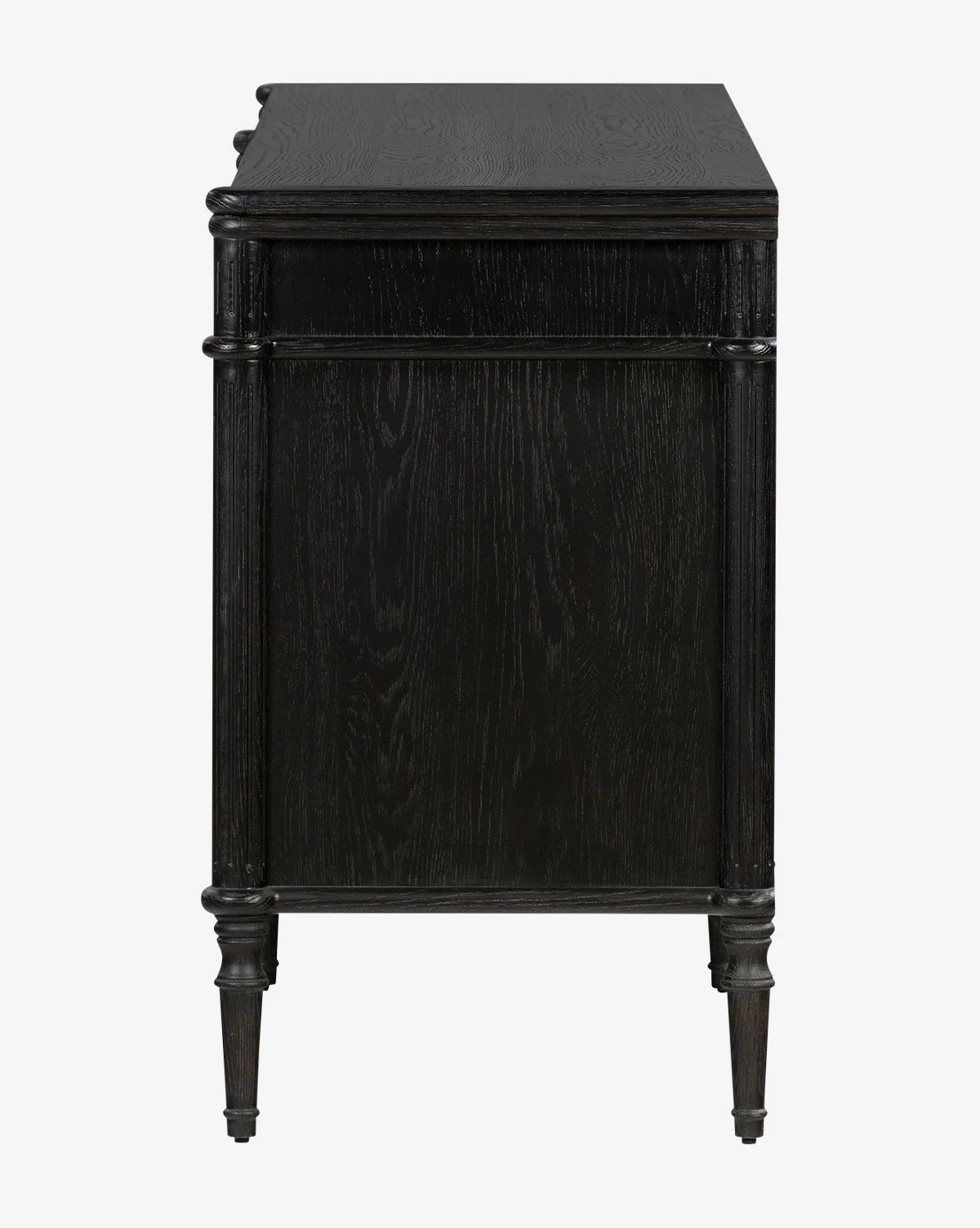 The compelling but relaxed design of the Dixon Sideboard elevates your space with its nuanced details. Made from oak in either a toasted or distressed black finish, the sideboards stately form holds top drawers and enclosed storage with aged brass hardware.