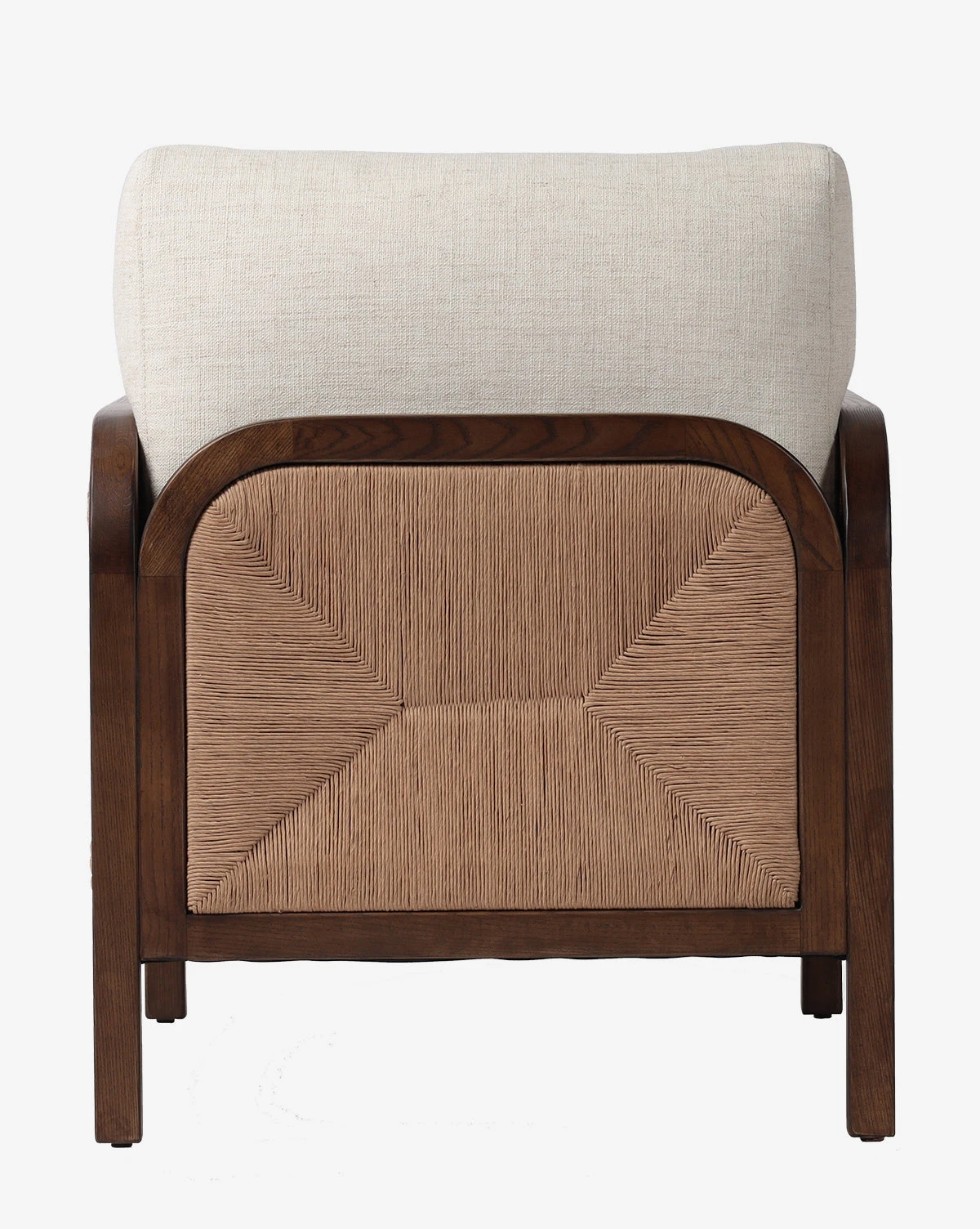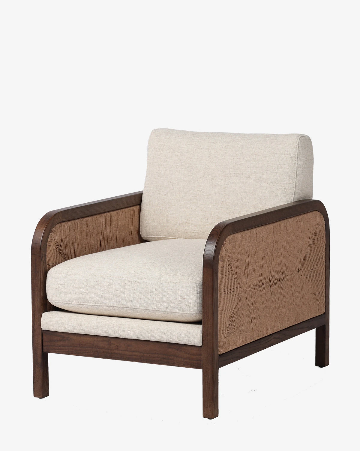 Comfortable and timeless, the Garvey Lounge Chair is crafted from solid ash, featuring paper rush sides. Its intricately detailed frame holds plush upholstered cushions in a cream tone. Styled in your living room or reading nook, this chair lends a sophisticated feel wherever it is placed.
