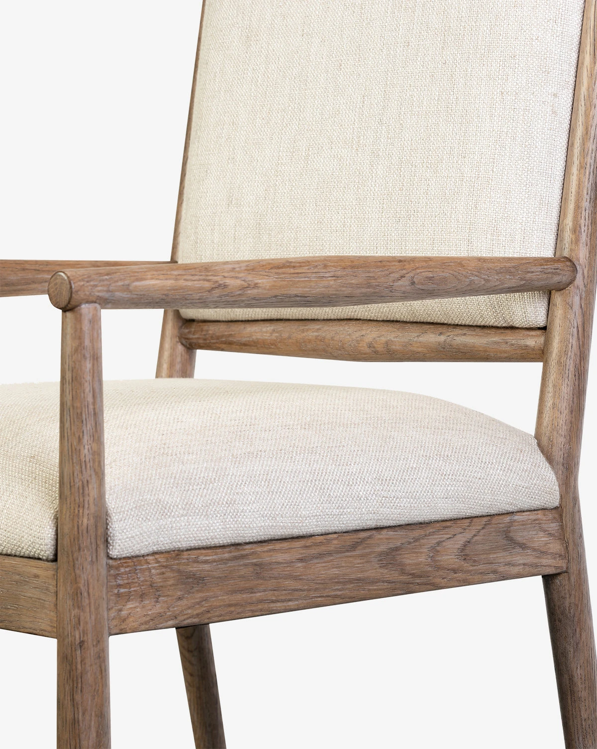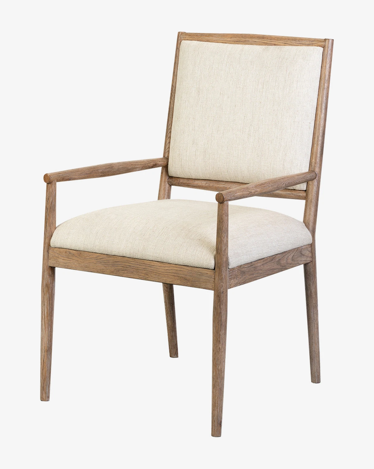With a timeless mix of materials, the Gomez Arm Chair creates a subtly elevated and inviting feel around your dining table. Its solid oak structure holds a seat and back cushion in a natural-toned upholstery.