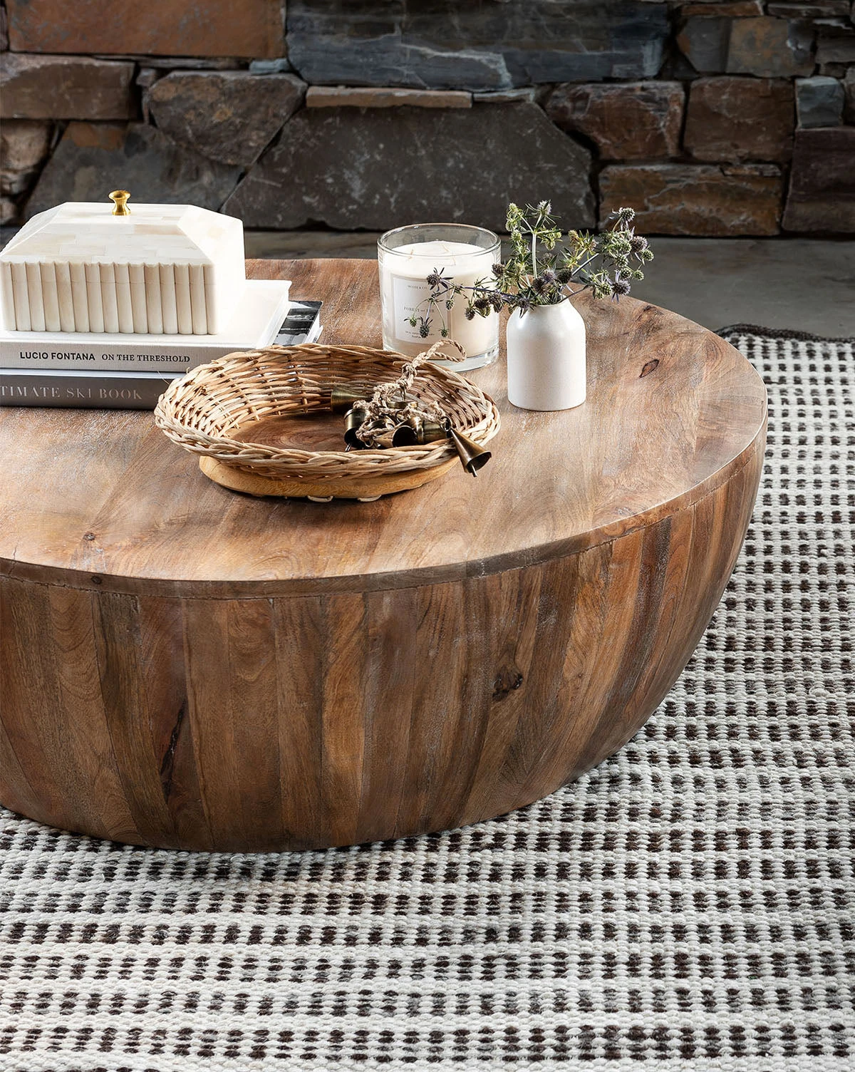 With a gentle curve and surrounding wooden slats, this sturdy table is finished with a sensational tobacco wash so it subtly brings a touch of nature into the home.