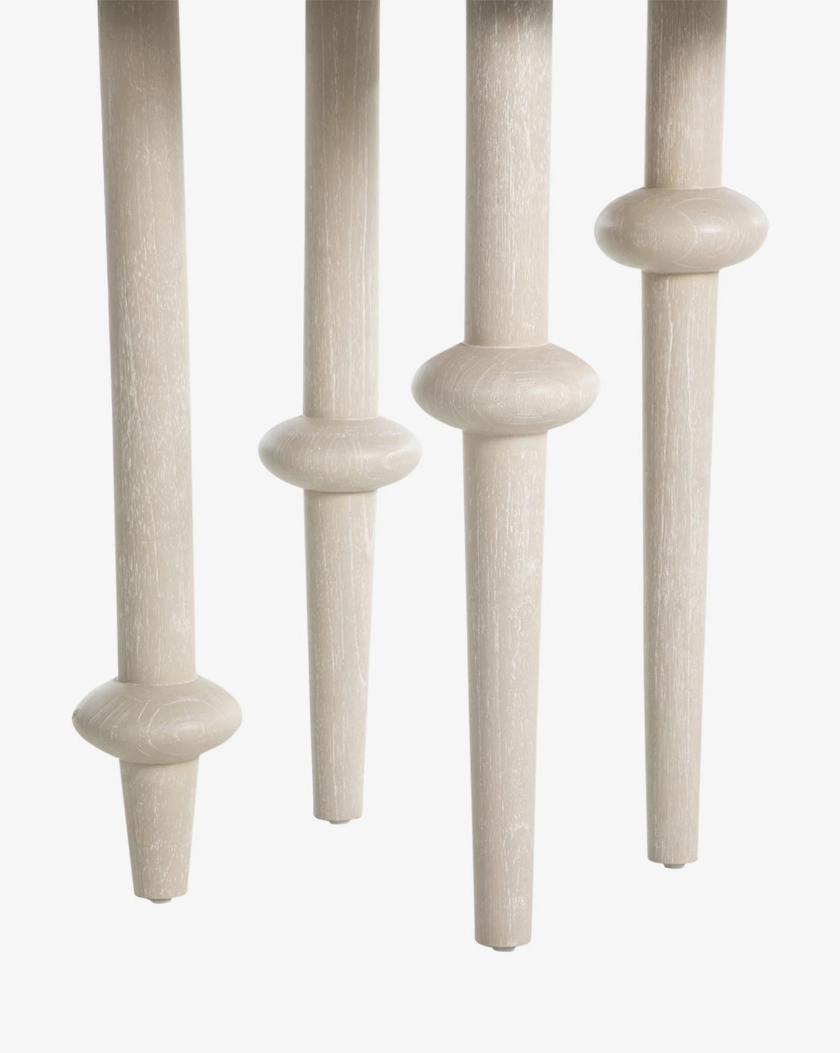 The Khadijah Side Table has a classic form with charming contemporary details. Crafted from mindi wood with a cerused white finish, the side table has a light palette that allows for versatility in styling in your living spaces.