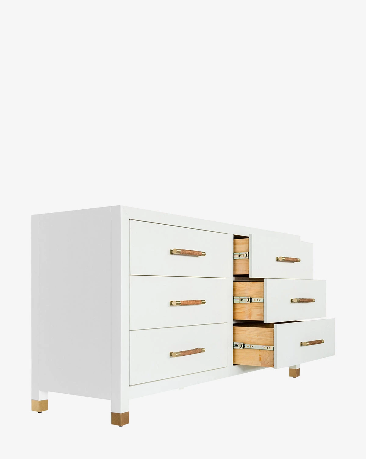 Simple yet elevated, the Leonardo Dresser features stunning details. The six drawers are complete with rattan wrapped handles, complementing its metallic details and straightforward design. Finished in either natural grasscloth or matte white, the wood frame holds spacious drawers for functional storage.