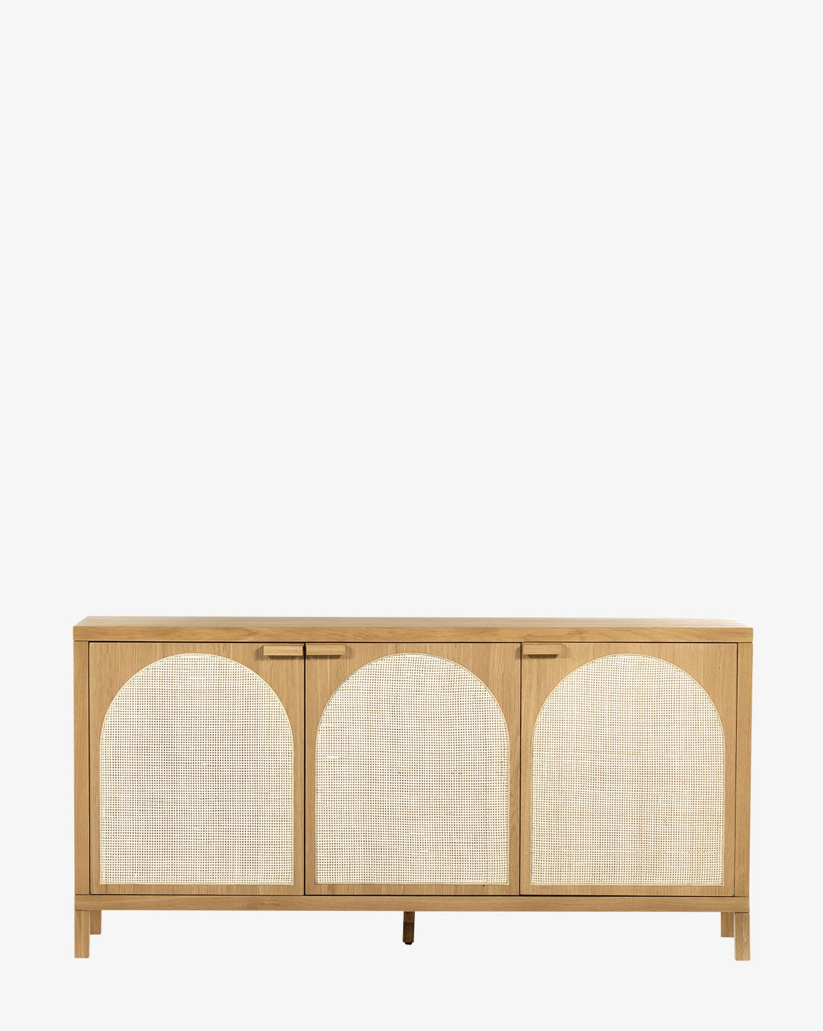 Natural caning and honey-finished oak give the Mora Sideboard its endearing mid-century style. Behind doors of inset, arched caning detail sits roomy interior shelving and rear cutouts for cord management. Completed with a block wood handles, the Mora Sideboard highlights natural textures and material for an elevated take on a playful piece.