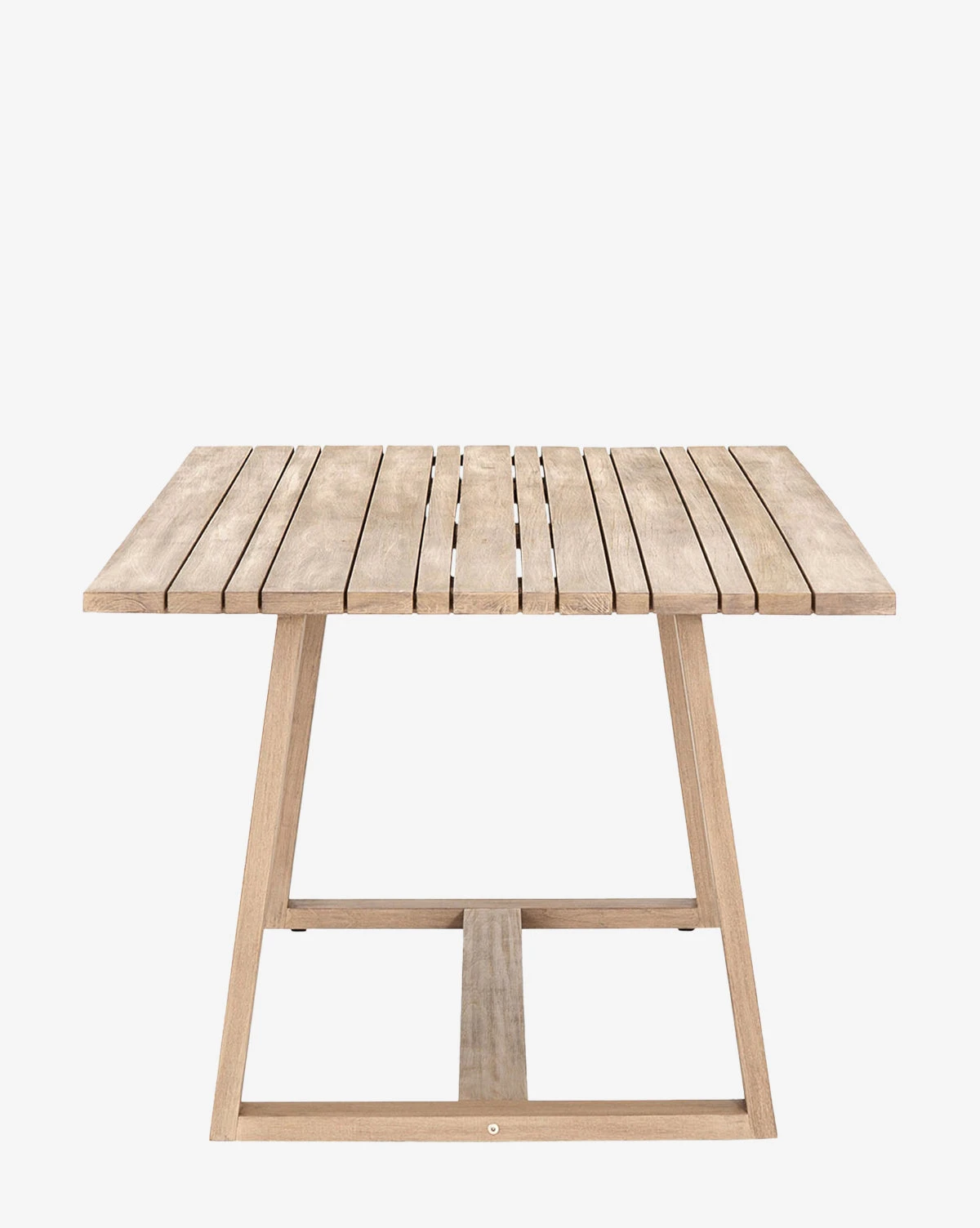 Make outdoor dining beautiful with the timeless form of the Newell Outdoor Dining Table. Crafted from planks of teak, and finished in a gray or brown hue, this table draws the eye with its architecturally inspired angled base, while its large form brings the family together for all sorts of memories and occasions.