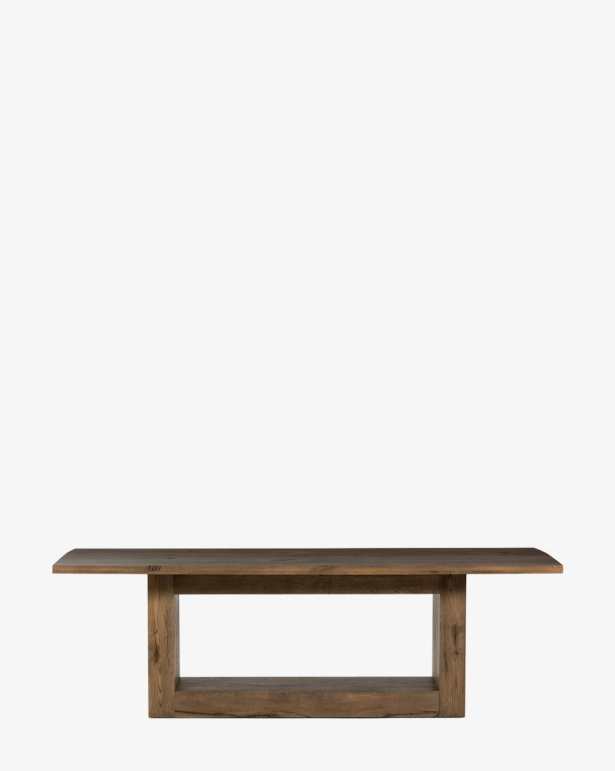 Crafted from a tick oak veneer, the Rafer Dining Table features natural detail from the woodgrain and a geometric base that brings a modern look to this farmhouse-inspired table. With a rustic fawn finish, the dining table has a refined yet organic feel, elevating your dining spaces.