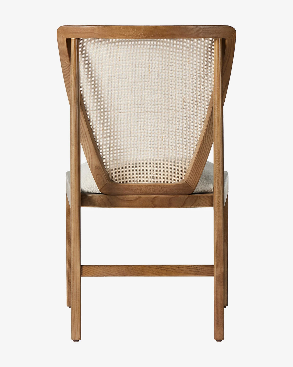 The Rogan Chairs modern design holds a cane back and a seat upholstered in cream performance fabric. The mixed materials provide a sophisticated sense of comfort, while the sleek frame brings a unique element to your dining room.