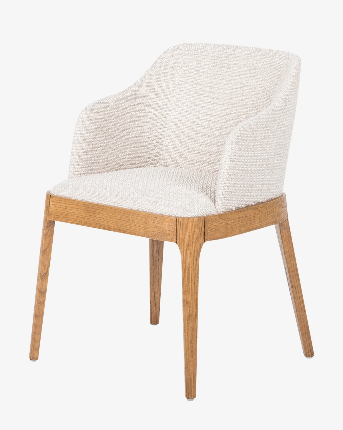 Effortlessly transitional, the Ryne Chair features a leggy base crafted from solid oak, topped with a shapely upholstered seat. Finished with high-performance fabric, tough enough for everyday dining, this modern meets organic chair easily elevates your dining design.