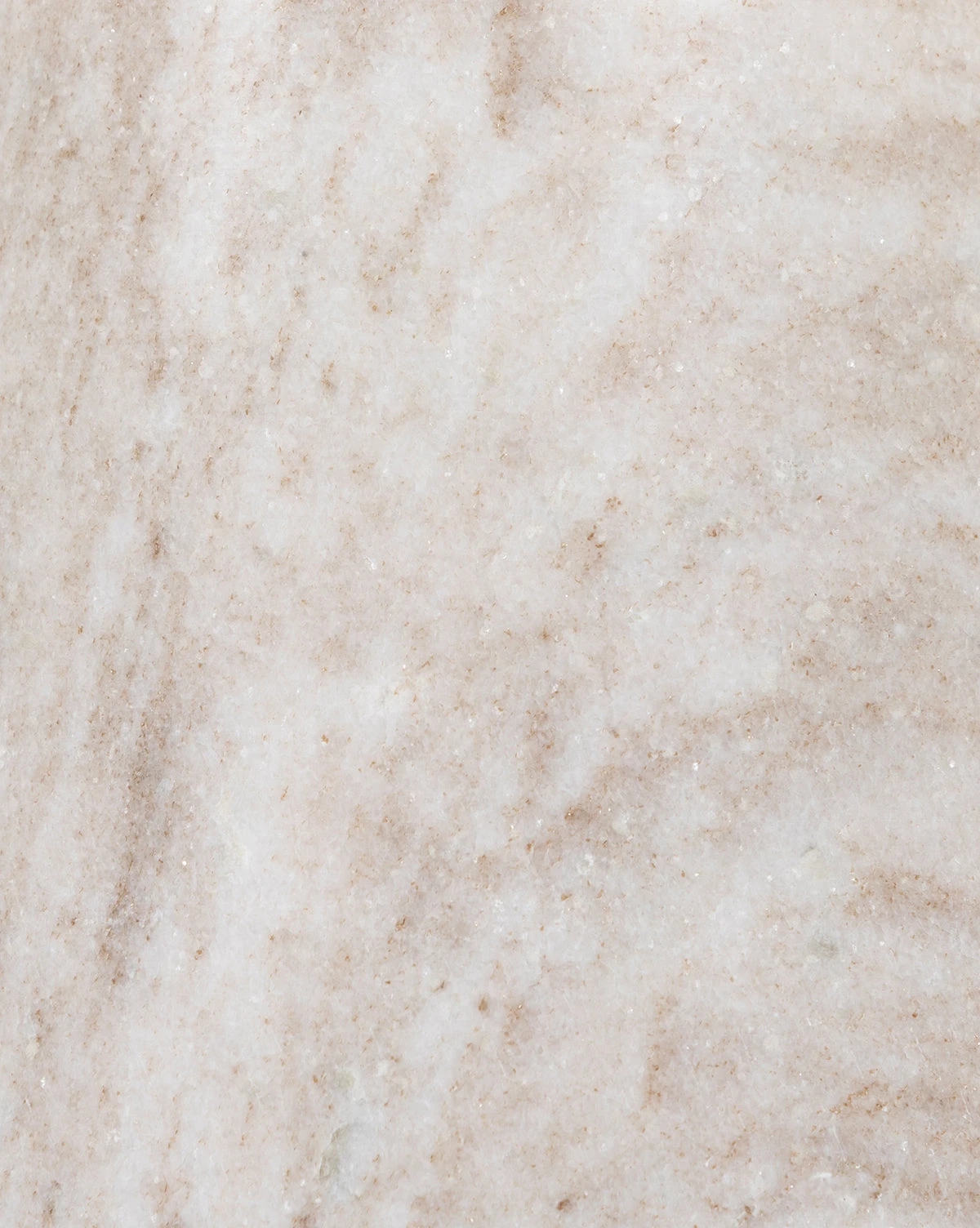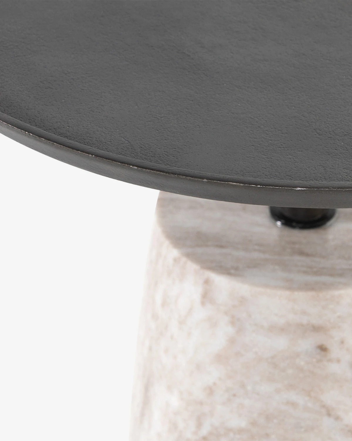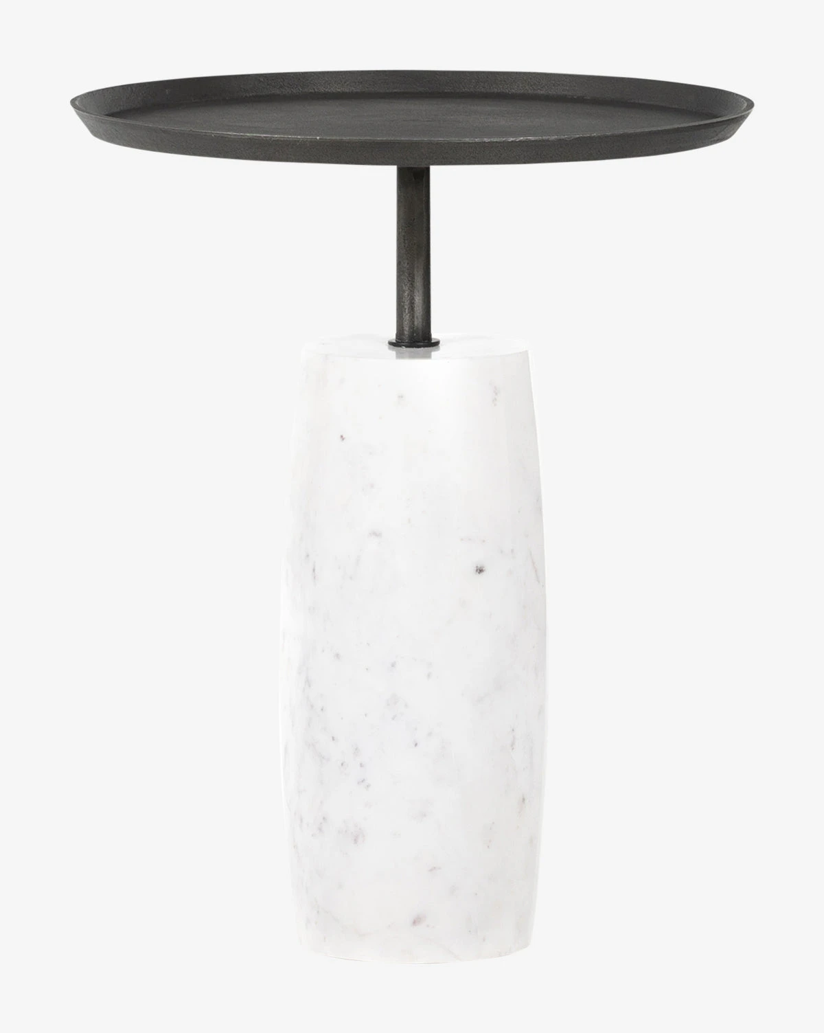 Cylindrical white marble serves as the base of the elegantly industrial Sheba Side Table. Its elongated oval base houses a slender stem and broad, lipped tabletop of aged grey iron. The natural movement of the iron is complemented by the dimensional veining of the marble, bringing direction and life to living spaces that complements sofas and sectionals.