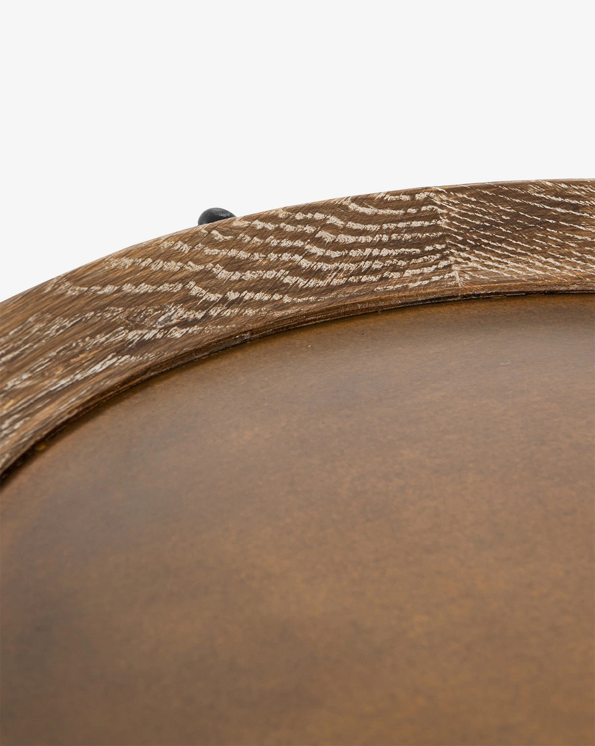 The Thomas Side Table was made to be the perfect tray with its low profile build and ridged edge. A slim black iron base supports its burnt oak and brass top for a truly industrial inspired table.