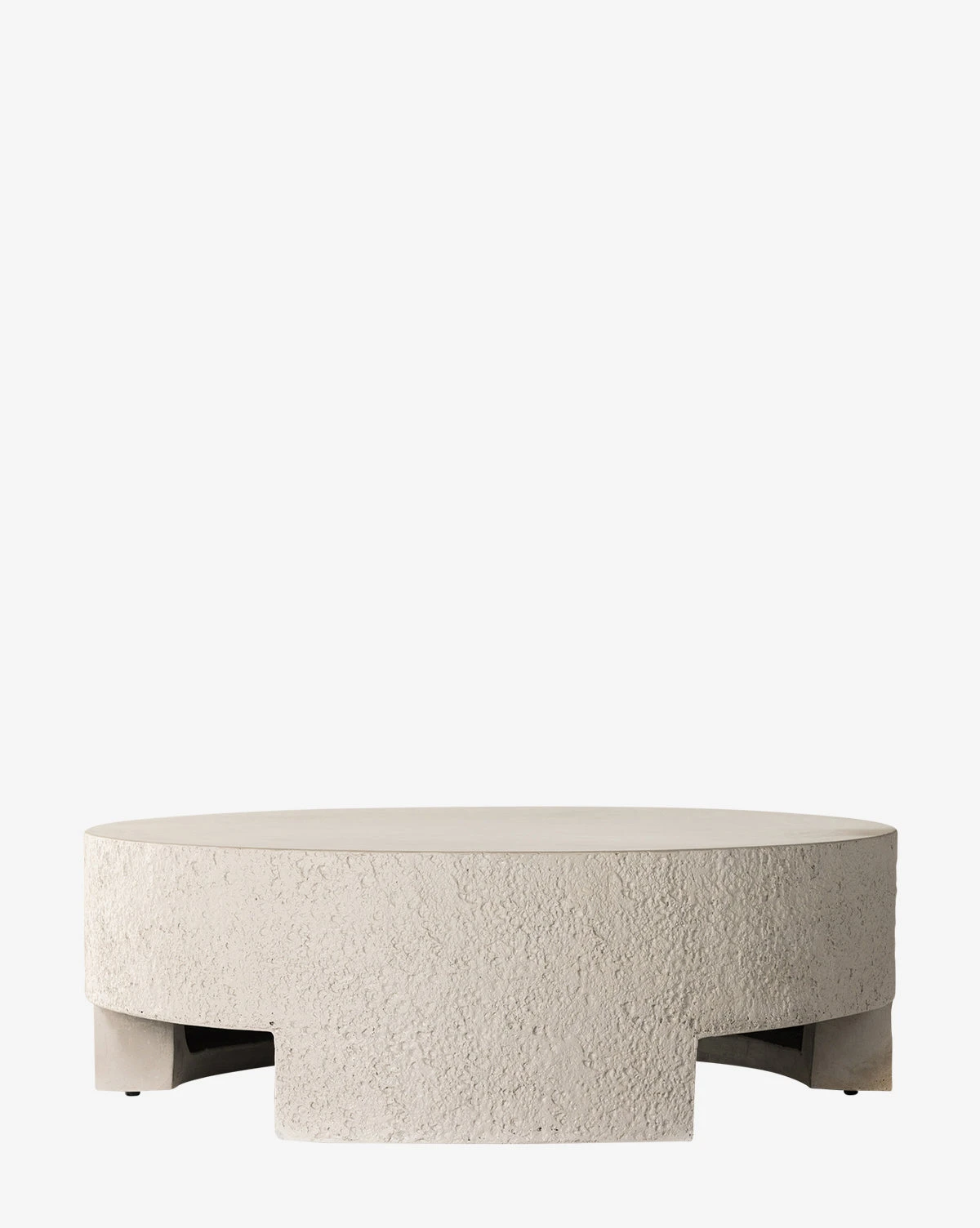 A cylindrical shape lifted by cutout legs gives the Tiah Outdoor Coffee Table a contemporary, geometric look that pairs well with its smooth top. This simple yet modern design is made from concrete in a white finish, making it easy to style with your current outdoor decor.