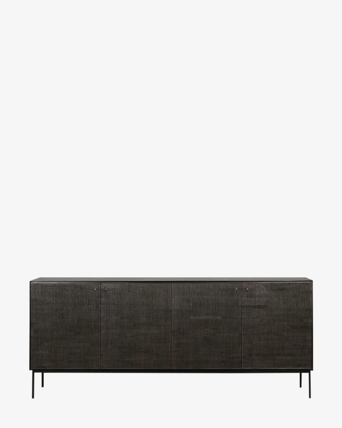 Made from 100% solid teak with a varnish finish and black metal legs, the Vander Sideboard is moody and captivating. Hand-carved textures on each of the four doors create a sense of movement, catching the light throughout the day. With interior shelves and sleek hardware, the sideboard is exceptionally functional.